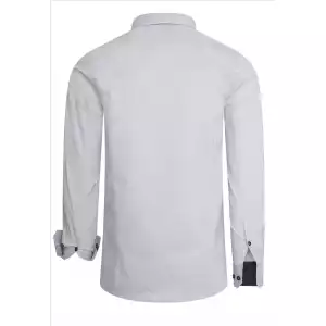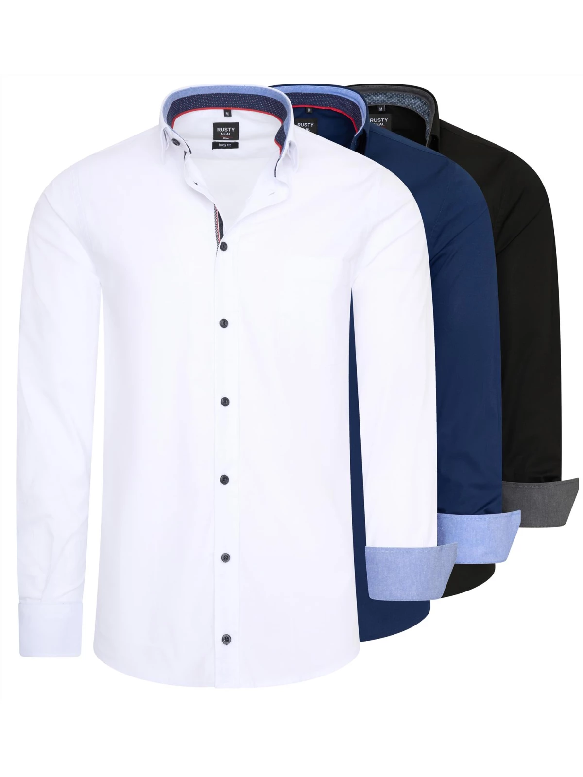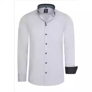 Grijs effen heren overhemd van het Merk Rusty Neal. Deze Italiaanse overhemden hebben een zakelijke uitstraling, maar zijn ook zeer geschikt als vrijetijdskleding. De Moda Italia blouse voor mannen heeft een blauw met witte stippen motief in de kraag. Tevens zijn de knopen zwart transparant uitgevoerd.