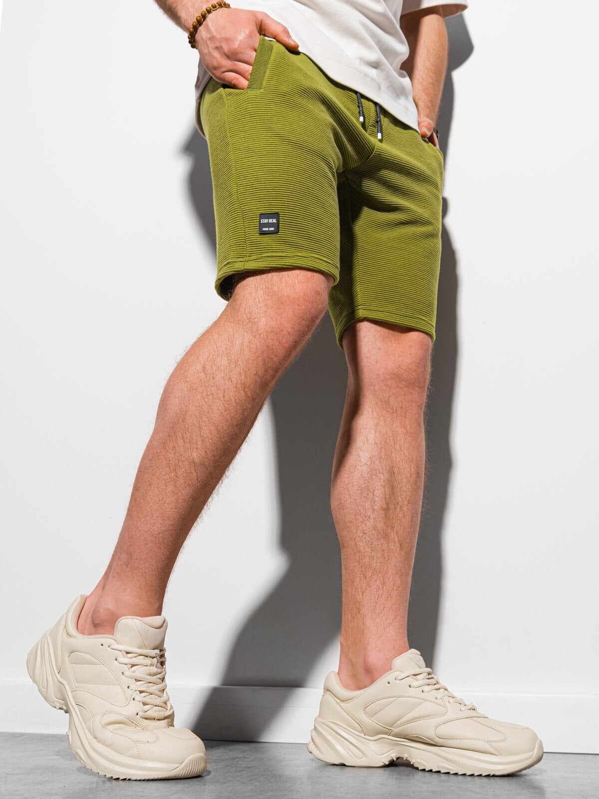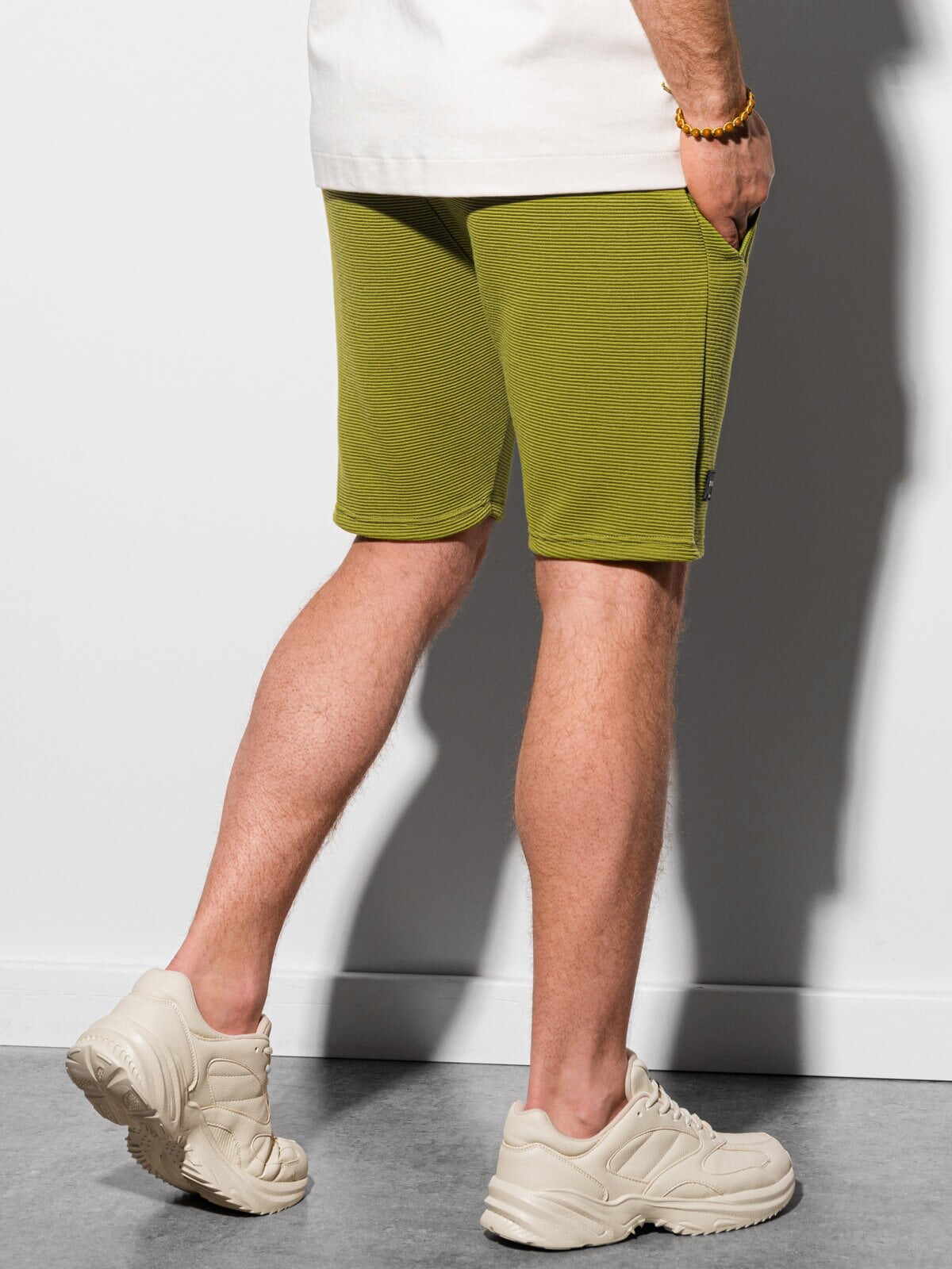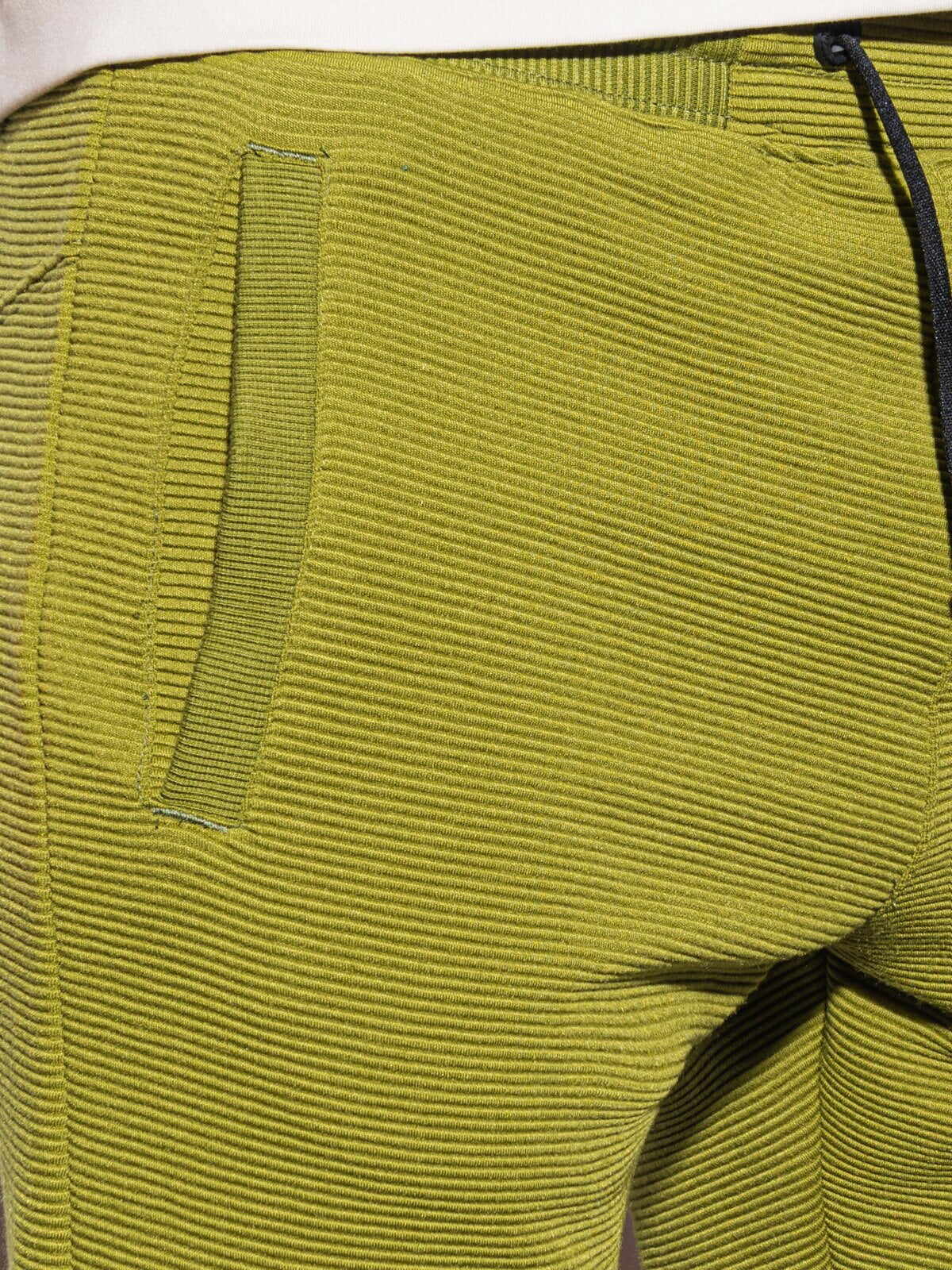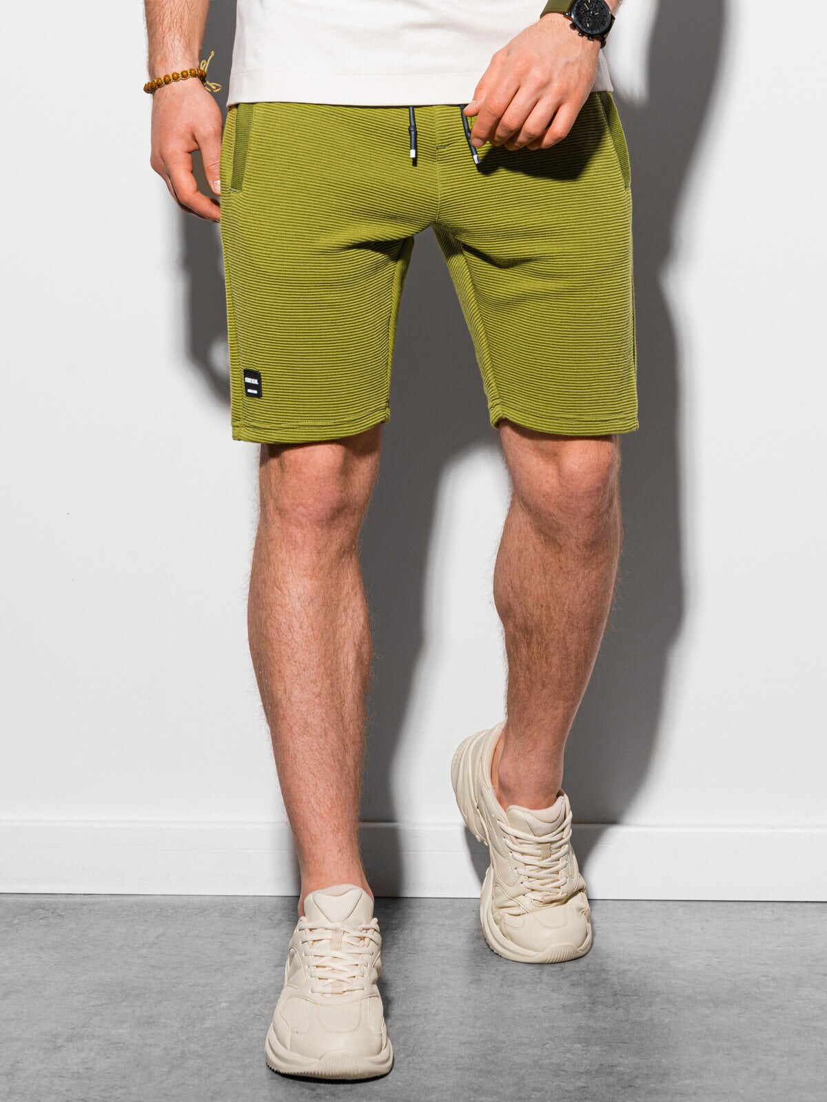 Korte broek voor heren. Deze comfortabele joggingbroek is gemaakt van lichte stretch. Ook is de olijf groene fijn geribde jog short voor heren voorzien van een zwart aantrekkoord. Tevens is deze korte broek voor mannen voorzien van steekzakken. De jog short is ideaal te dragen voor casual en sportieve gelegenheden.
