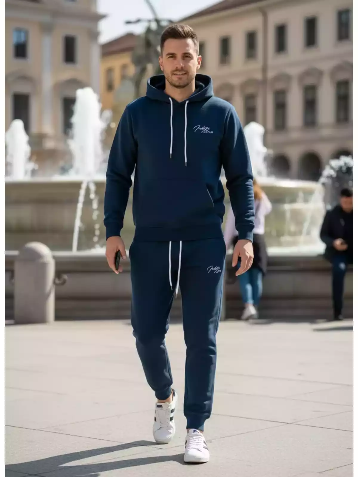 De verstelbare tailleband zorgen voor een fijne fit, terwijl de steekzakken voldoende ruimte bieden voor je essentials. De capuchon geeft dit joggingpak een sportieve en moderne uitstraling. Ideaal voor fitness, wandelen, of relaxen in huis.