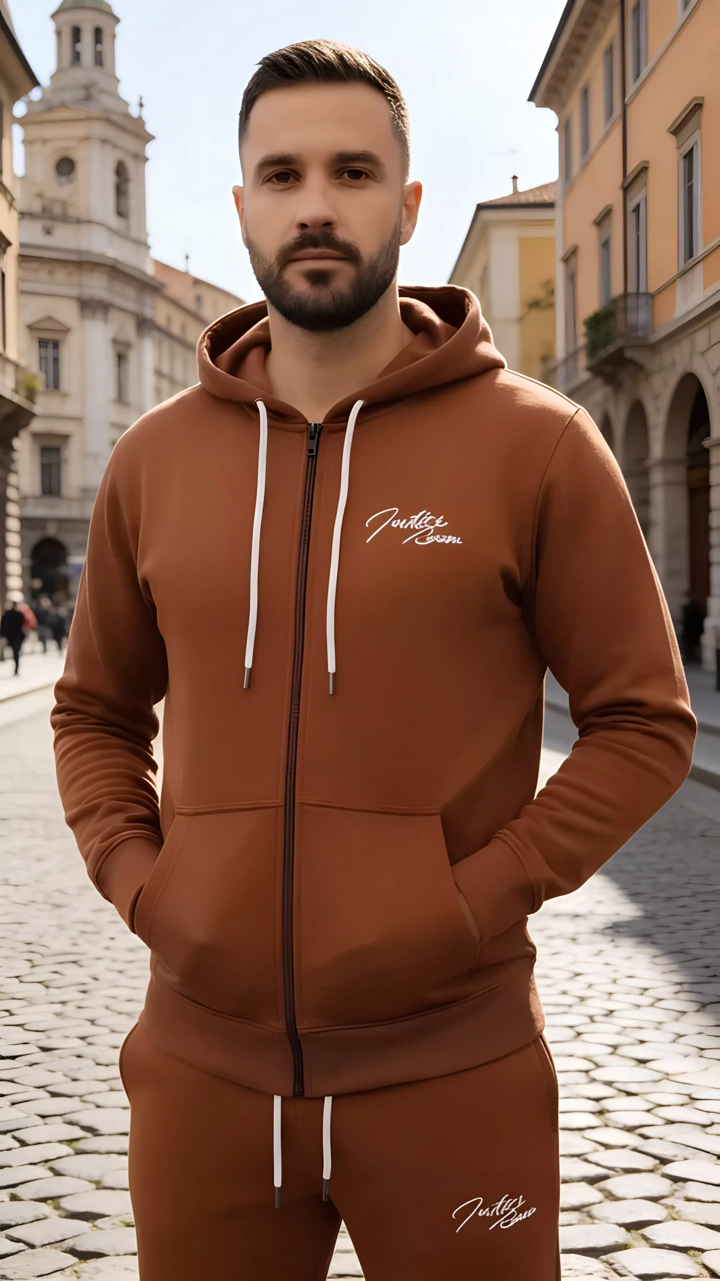 De verstelbare tailleband zorgen voor een fijne fit, terwijl de steekzakken voldoende ruimte bieden voor je essentials. De capuchon geeft dit joggingpak een sportieve en moderne uitstraling. Ideaal voor fitness, wandelen, of relaxen in huis.