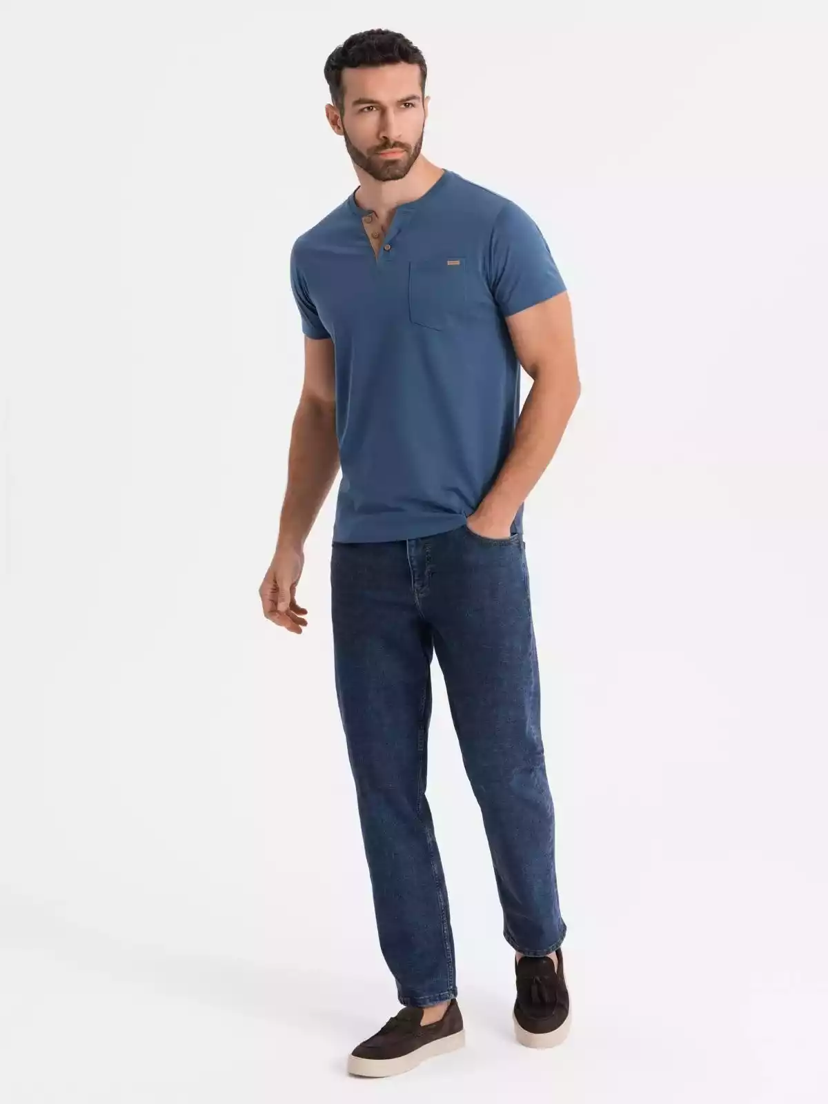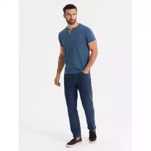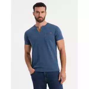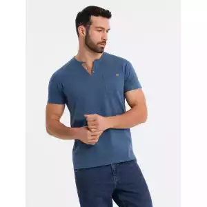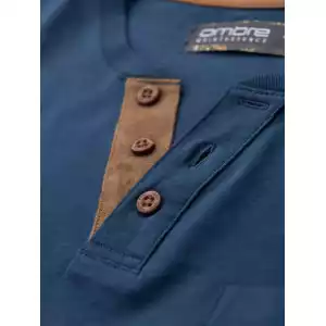 Op zoek naar een stoer én stijlvol T-shirt? Dit blauwe heren T-shirt met knoopsluiting en suède inzet is de perfecte mix van comfort en uitstraling. Het T-shirt is gemaakt van 100% ademend katoen en heeft een klassieke pasvorm met korte mouwen. De knopen en het contrasterende suèdetrim zorgen voor een unieke, moderne touch. Ideaal voor een casual, sportieve look.