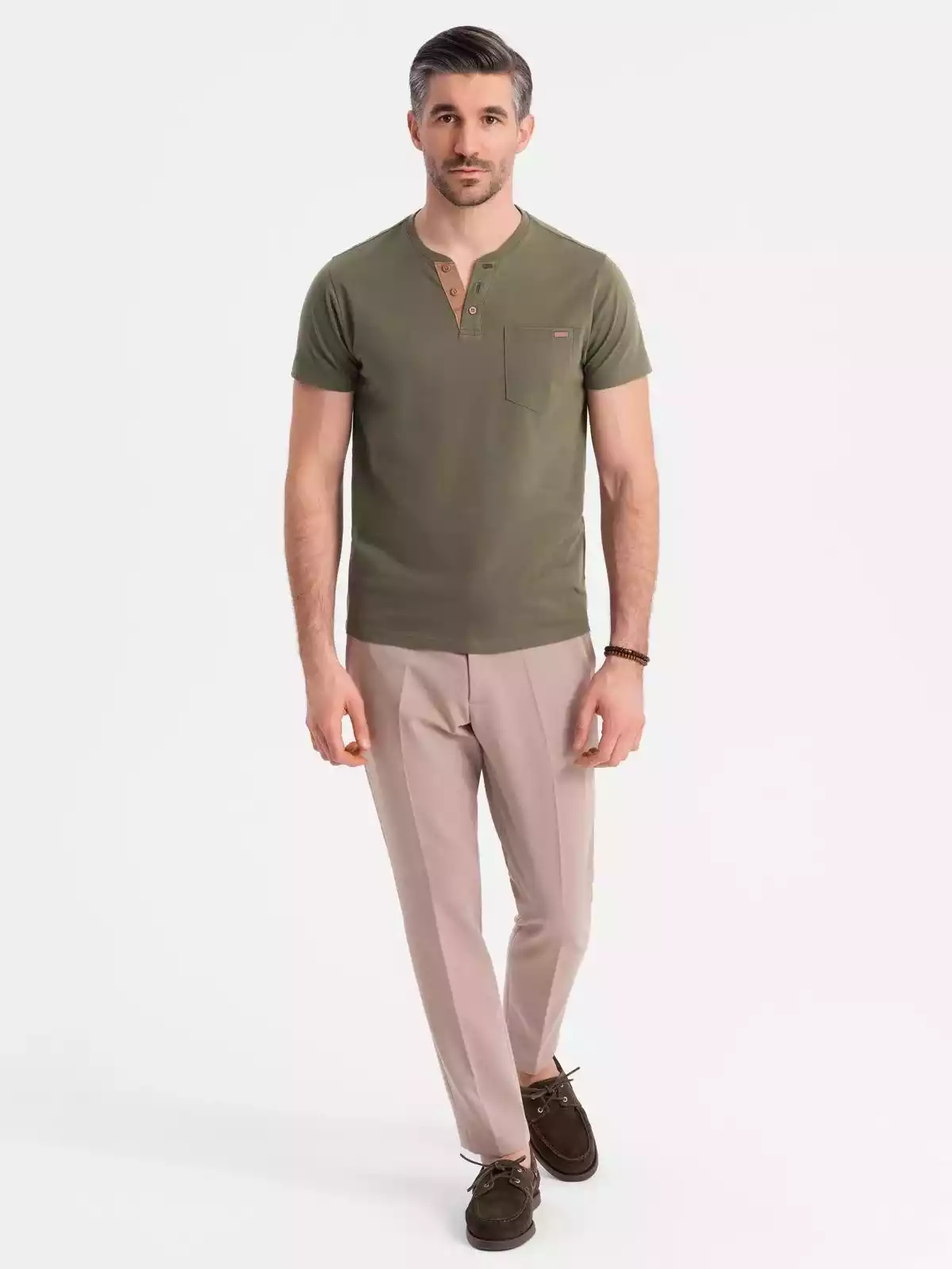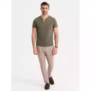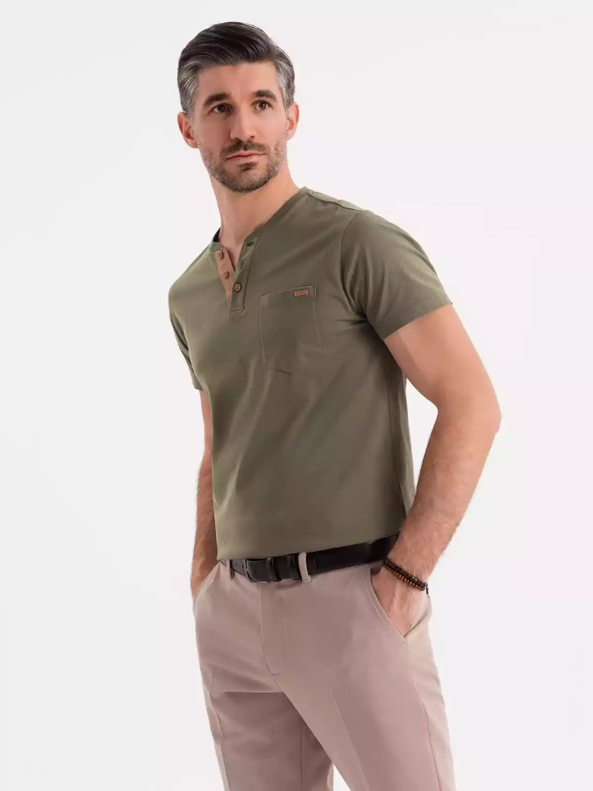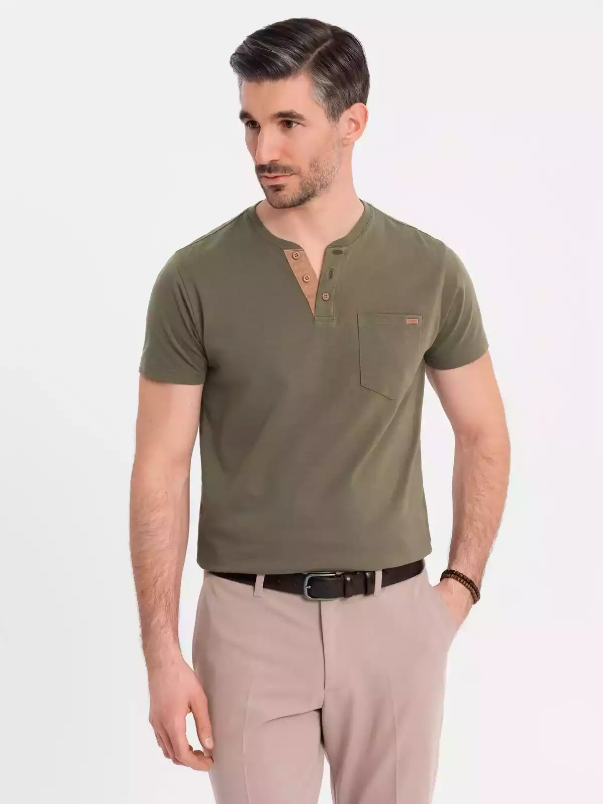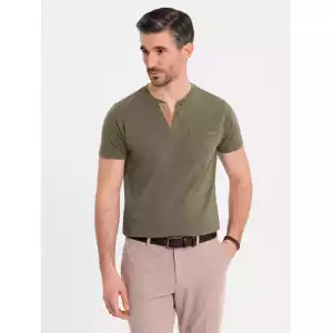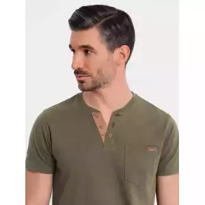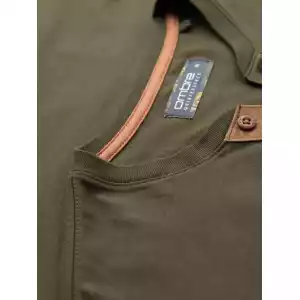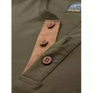 Op zoek naar een stoer én stijlvol T-shirt? Dit donkergroene heren T-shirt met knoopsluiting en suède inzet is de perfecte mix van comfort en uitstraling. Het T-shirt is gemaakt van 100% ademend katoen en heeft een klassieke pasvorm met korte mouwen. De knopen en het contrasterende suèdetrim zorgen voor een unieke, moderne touch. Ideaal voor een casual, sportieve look.